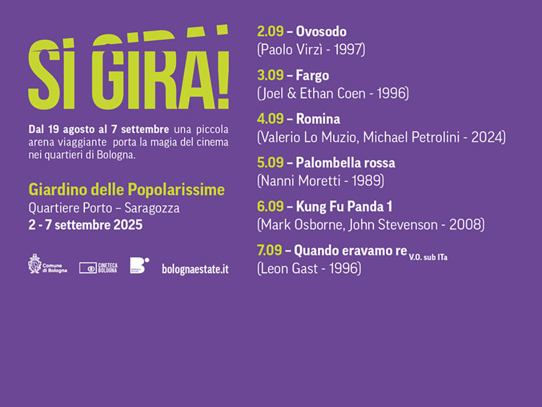 Sei serate dedicate al cinema tra classici e nuovi sguardi locali, in un programma che unisce generazioni e linguaggi diversi. Nell’area polifunzionale verranno proiettati: Ovosodo – Paolo Virzì, 1997; Fargo – Joel & Ethan Coen, 1996, il noir ironico che ha fatto scuola; Romina – Valerio Lo Muzio, Michael Petrolini, 2024, ritratto intimo della periferia bolognese alla presenza dei registi; Palombella rossa – Nanni Moretti, 1989; Kung Fu Panda – Mark Osborne, 2008; Quando eravamo re – Leon Gast, 1996.