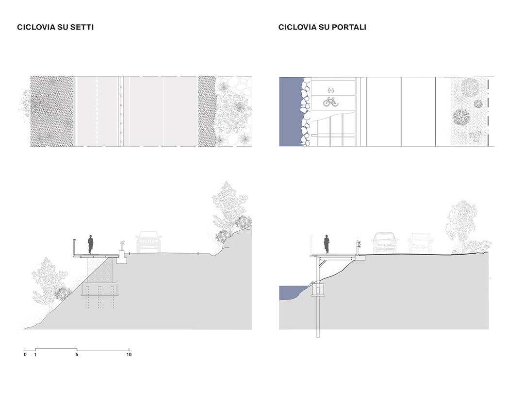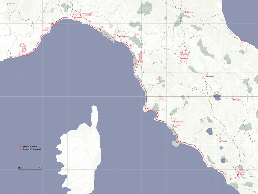 Il percorso della Ciclovia Tirrenica si distingue per l’“affaccio sul mare”, un elemento che, da un lato, ne costituisce una condizione di grande pregio, ma, dall’altro, rappresenta anche una difficoltà logistica, a causa della coesistenza sulla costa di funzioni residenziali e turistiche, accostate a quelle legate alla mobilità (rete stradale, ferroviaria, passeggiate a mare, ecc.). Il progetto ha adottato soluzioni tipologiche diverse e adeguate a ogni situazione, al fine di garantire la continuità del percorso senza compromettere il suo valore paesaggistico.
