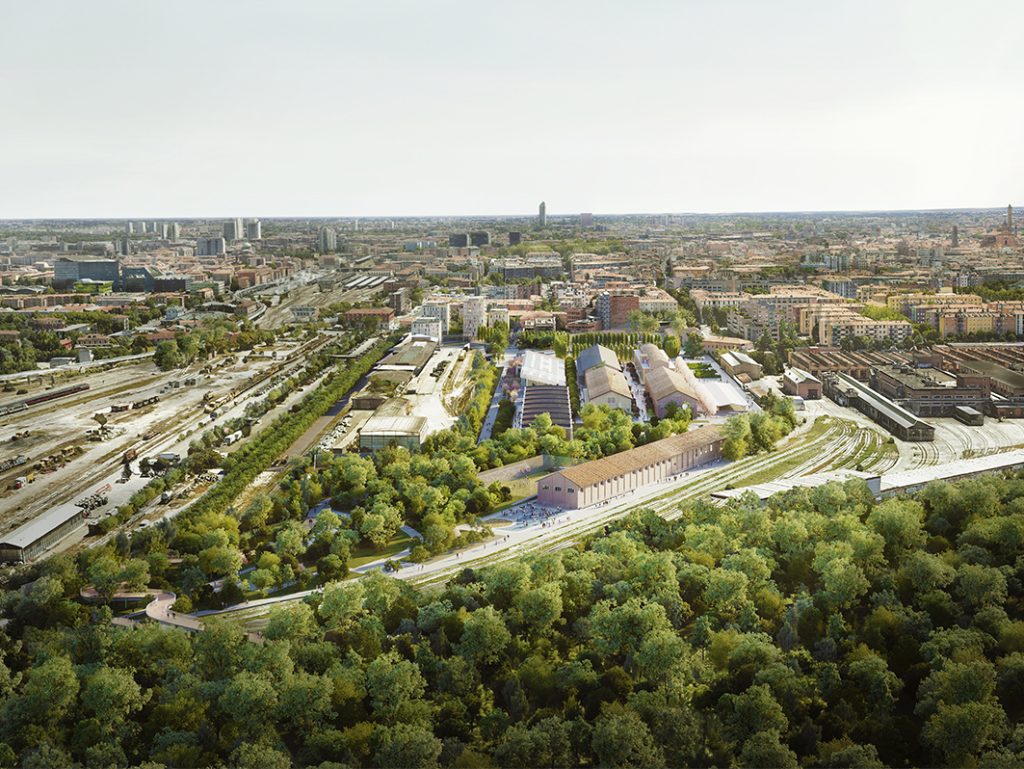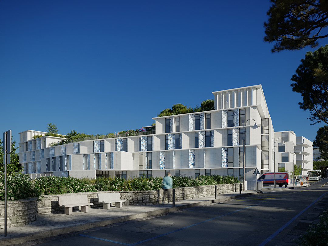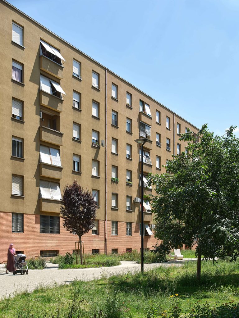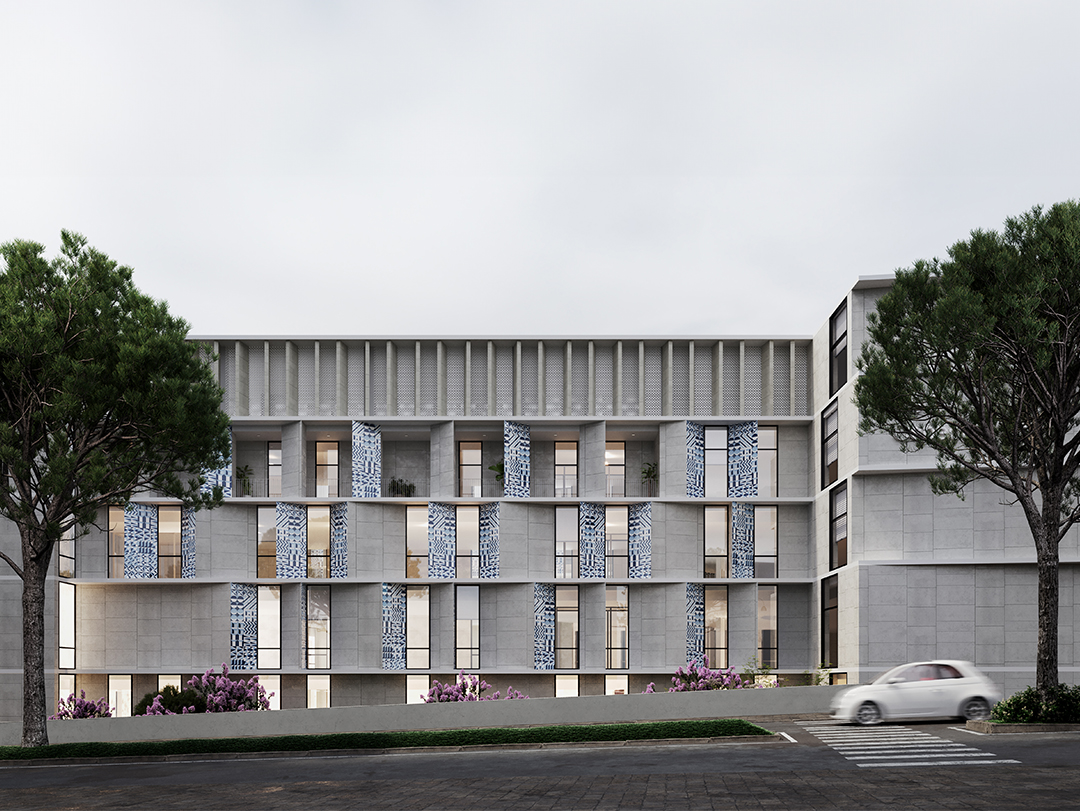 Il principale obiettivo di sviluppo urbano del progetto su larga scala, le cui dimensioni superano di gran lunga quelle del tessuto circostante, è garantirne l’integrazione nel paesaggio. La tridimensionalità dell’involucro e l’articolazione volumetrica dei componenti edilizi, ricercano un linguaggio architettonico in scala con il contesto. La facciata appare come una scultura in rilievo rivestita con piastrelle di gres chiaro alternate a motivi geometrici basati sulla bicromia bianco e blu, citazione a Giò Ponti. L’edificio assume un carattere ben connotato; allo stesso tempo la geometria dei prospetti consente di ottenere l’auto-ombreggiamento per la protezione solare.