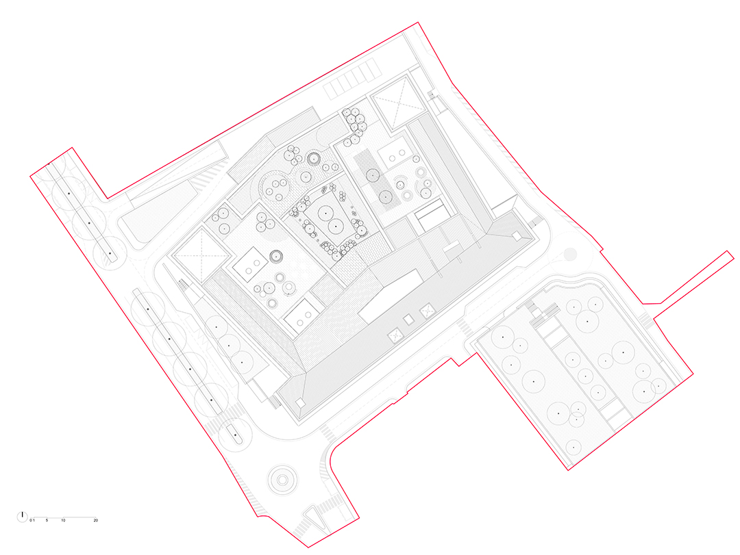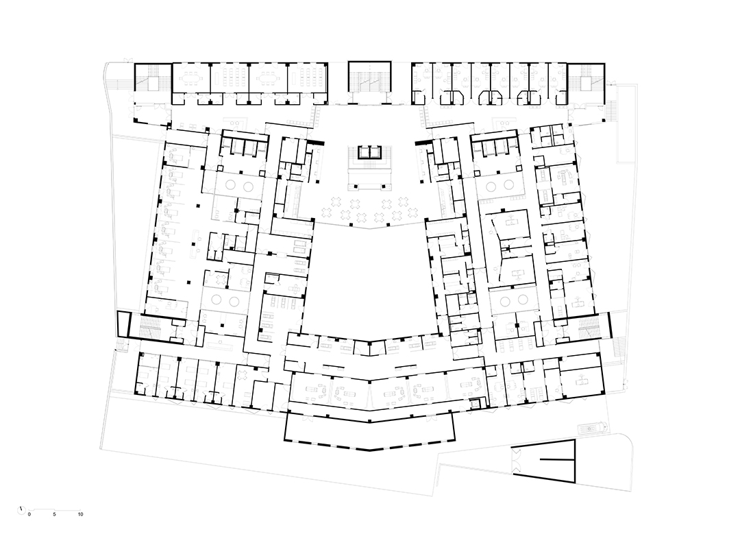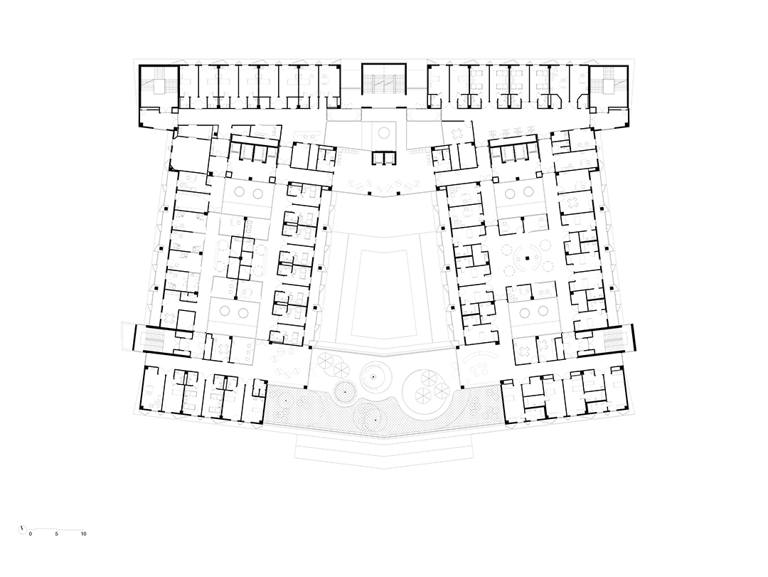 La delicatezza del contesto e le difficoltà realizzative di un intervento di importanti dimensioni in un ambito fortemente urbanizzato, hanno portato alla ricerca di una soluzione orientata a compattare il programma funzionale sul perimetro di un’ampia corte centrale. Il Polo sfrutta la complessa orografia del terreno nella definizione di cinque piani organizzati secondo livelli di intensità di cura e per aree funzionali omogenee suddivise in dipartimenti. Questa soluzione supera la rigida separazione fra specialità cliniche, per orientare l’attività secondo il bisogno di assistenza dell’utente.