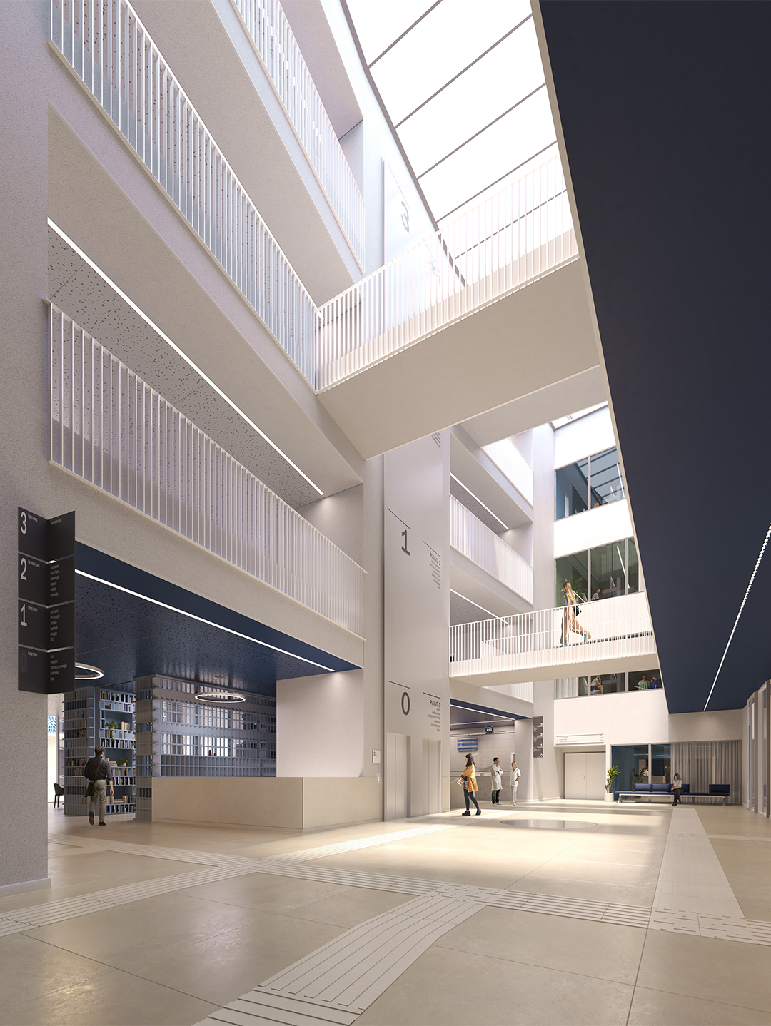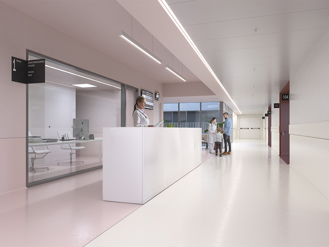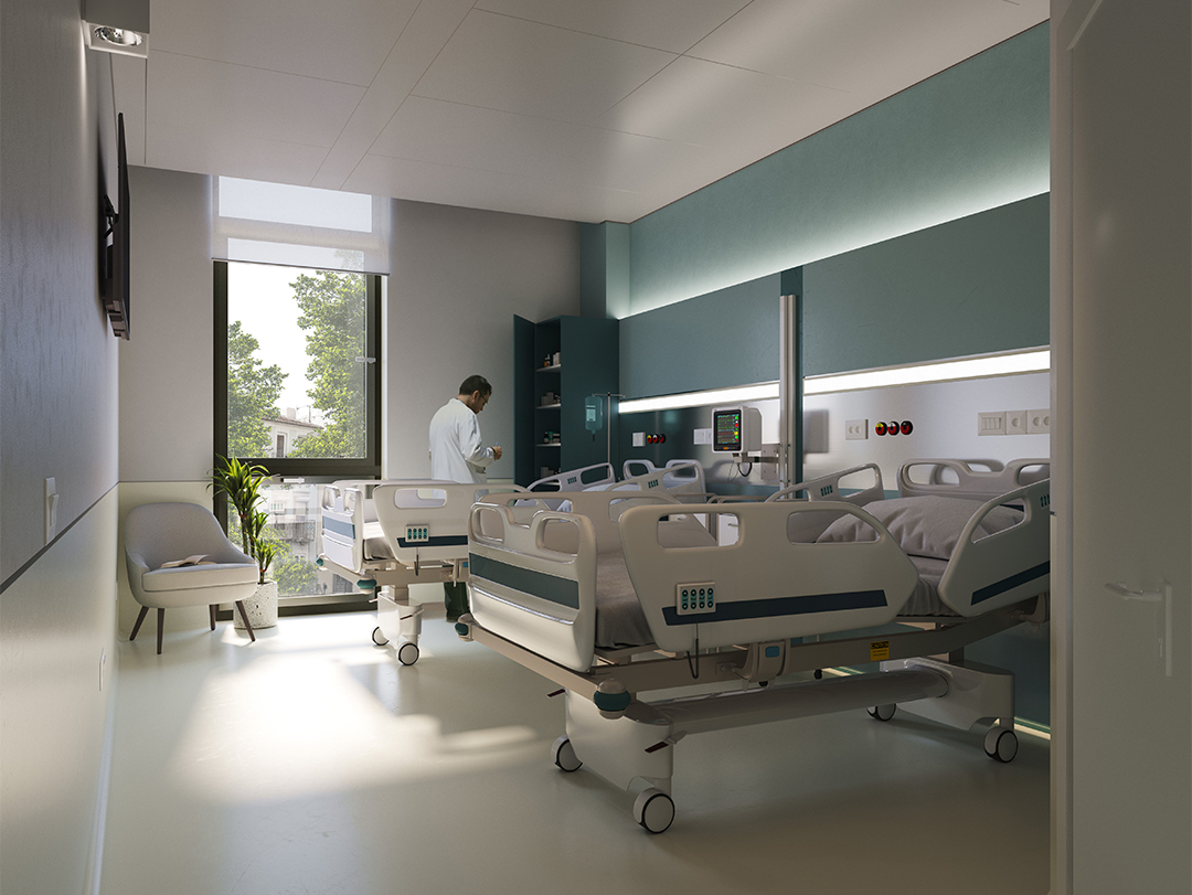 Attraverso l’integrazione di soluzioni sostenibili, risparmio energetico e maggior vegetazione all’esterno e all’interno dei cortili, lo scopo è progettare un ospedale più verde, spazi piacevoli con benefici curativi per i pazienti ed un ambiente fisico positivo per dipendenti e visitatori. Il concetto di “umanizzazione” inteso come studio dei colori, della luminosità e degli arredi, risulta fondamentale nella definizione delle camere di degenza e nella previsione di “spazi di decompressione” per tutti gli ospiti della struttura, capaci di connotare l’ambiente non come ospedaliero, bensì come “famigliare”.