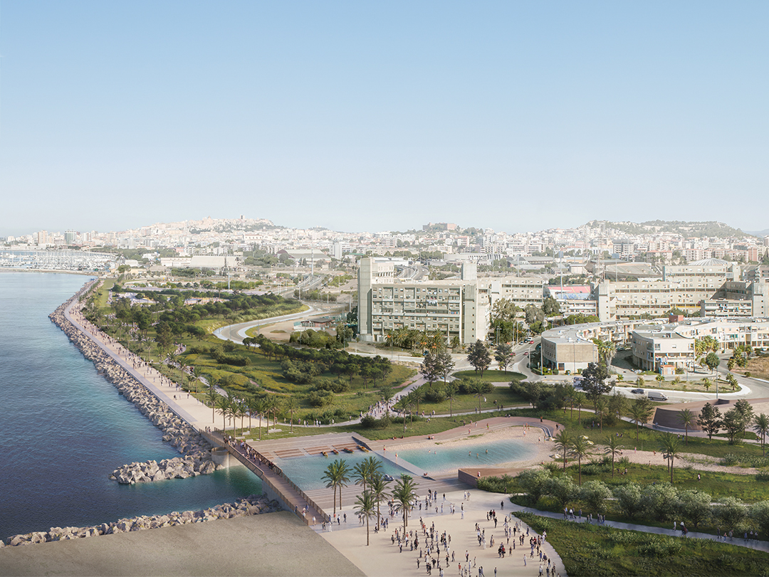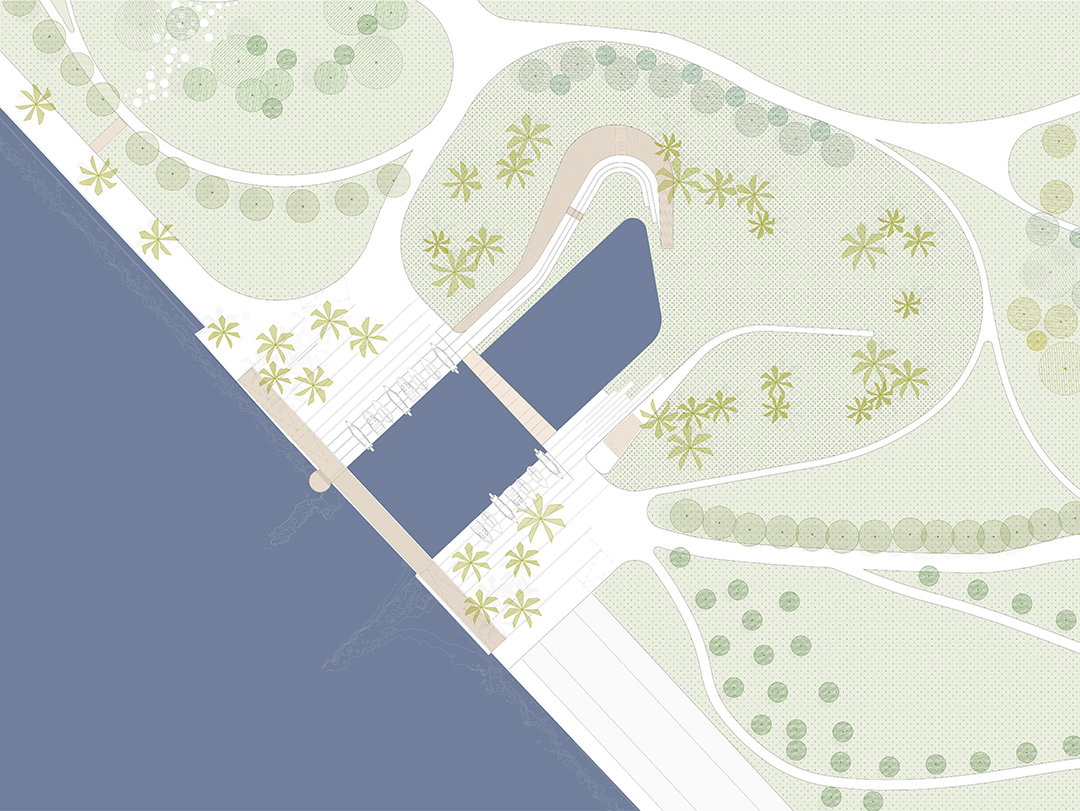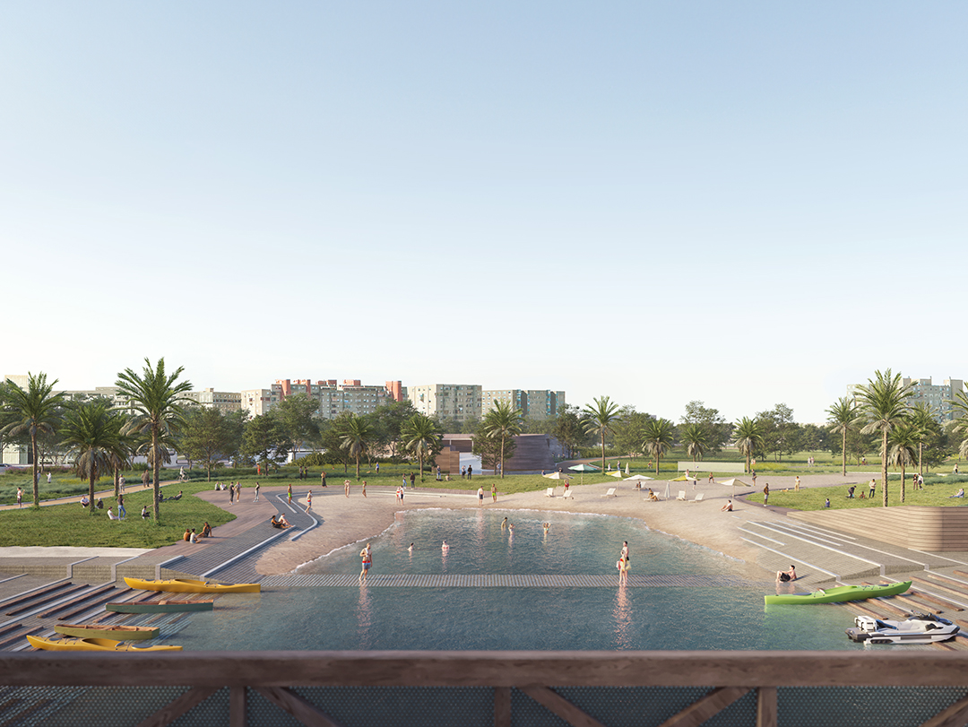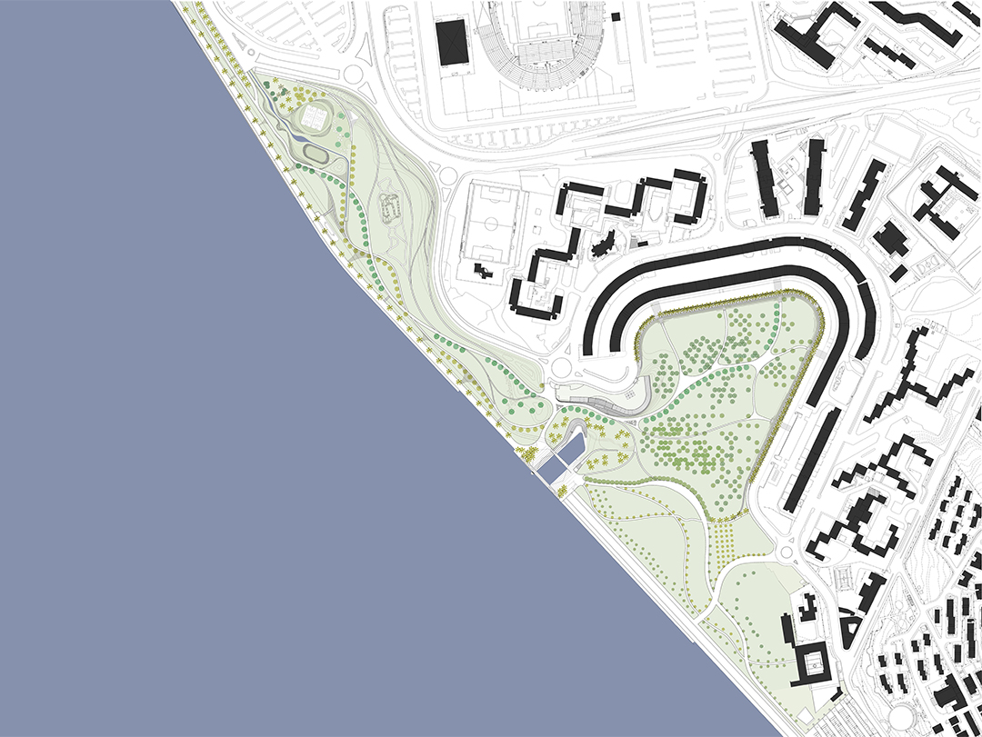 Sono infatti previste: aree gioco inclusive e articolate per età, spazi per la fruizione balneare, spazi pubblici, ambiti naturalistici, campi sportivi polivalenti e un bike park. Tutte queste aree sono progettate in continuità tra loro, per rendere trasversale l’utilizzo dell’intero parco. All’interno del parco sono previsti anche due edifici a servizio dell’utenza: un punto di ristoro con ristorante e le attività dell’associazione dei pescatori, e un secondo spazio attrezzato a supporto dell’attività balneare.