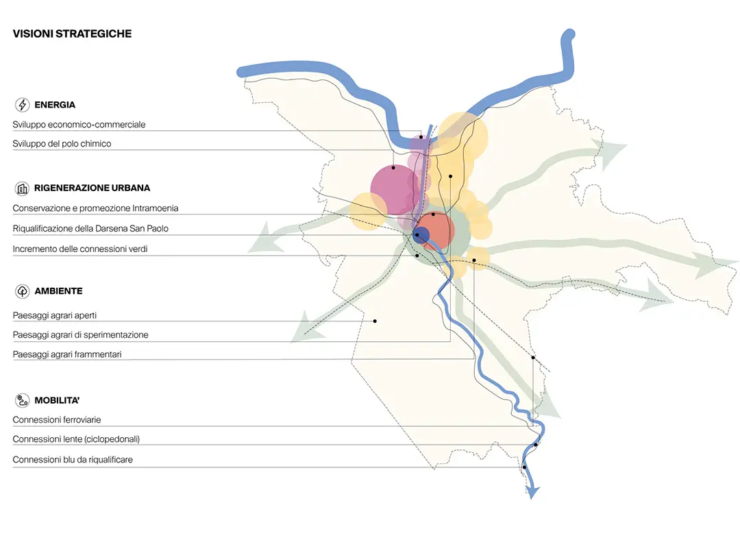 Le principali direttrici strategiche del Piano si definiscono a partire dalla compresenza e dall’interazione di diverse visioni del futuro della città: