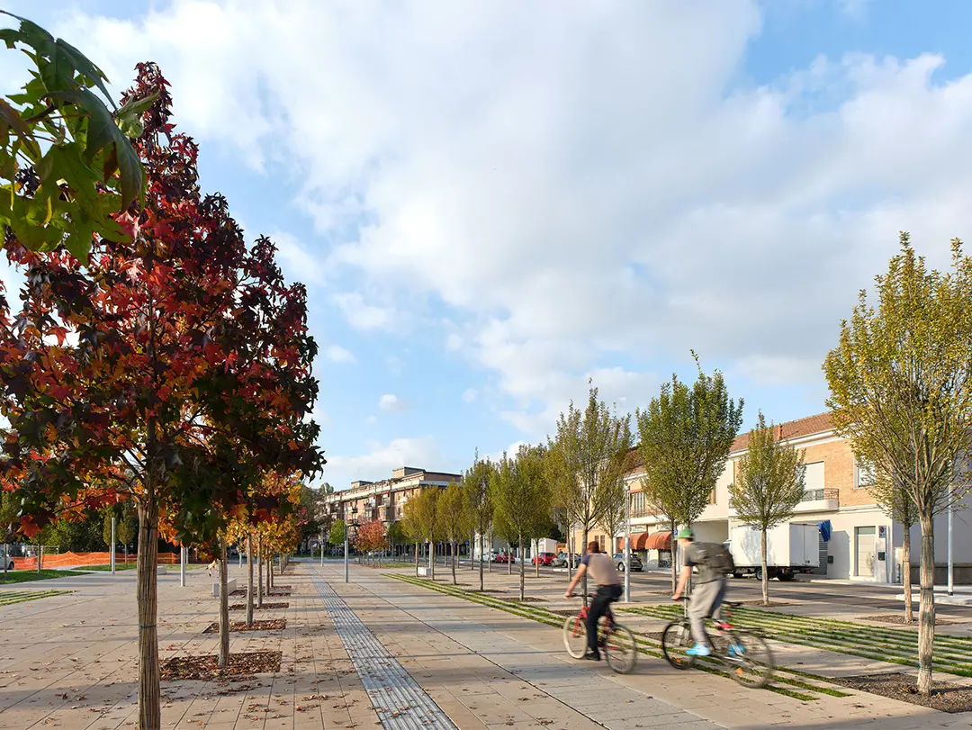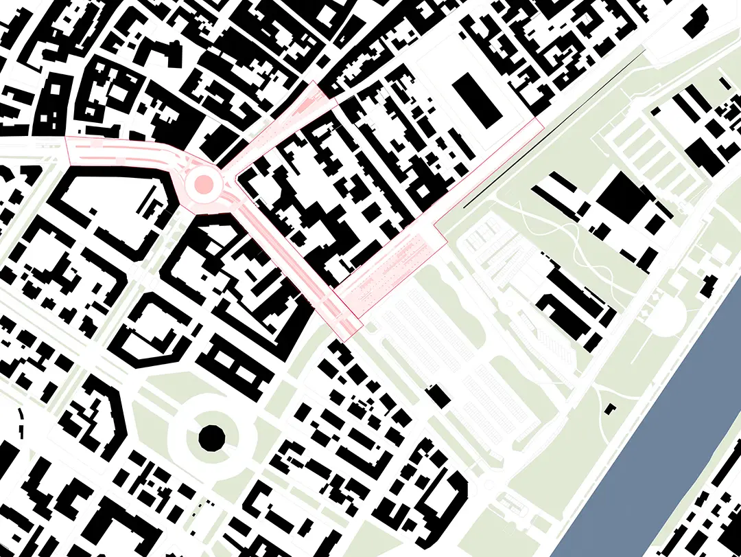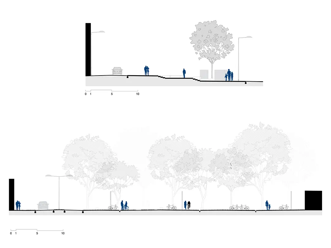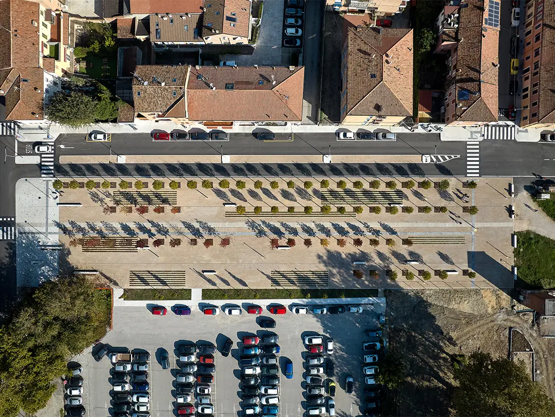 Il team ha affrontato l’intervento partendo da una analisi dello stato di fatto e delle potenzialità latenti dell’intera area. Esse hanno permesso di orientare l’approccio metodologico verso un unico intervento, sistemico e multiforme al tempo stesso, in grado di disegnare in modo organico una porzione di città contemporanea. L’organicità della realizzazione è esplicitata in un sistema di flussi ad alta permeabilità lenta e senza conflittualità con la rete carrabile; un disegno di suolo abilitante, improntato alla massima accessibilità, sia nei confronti delle differenti tipologie di disabilità, sia nella capacità di arricchire di supporti e collegamenti le diverse ‘anime funzionali’ presenti in questa porzione di città.