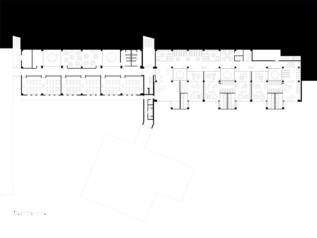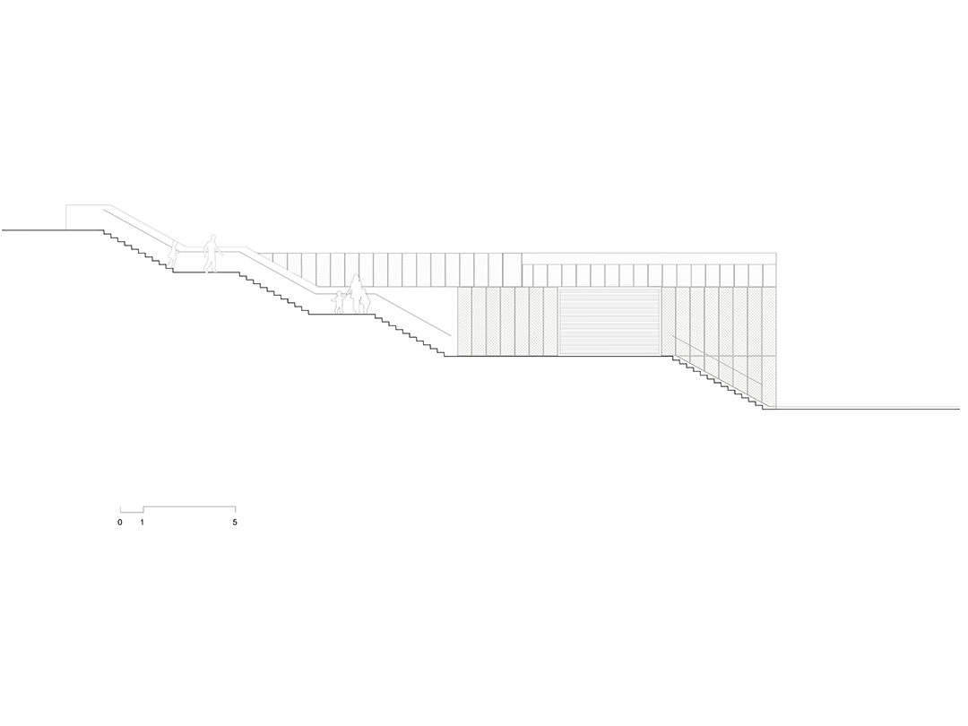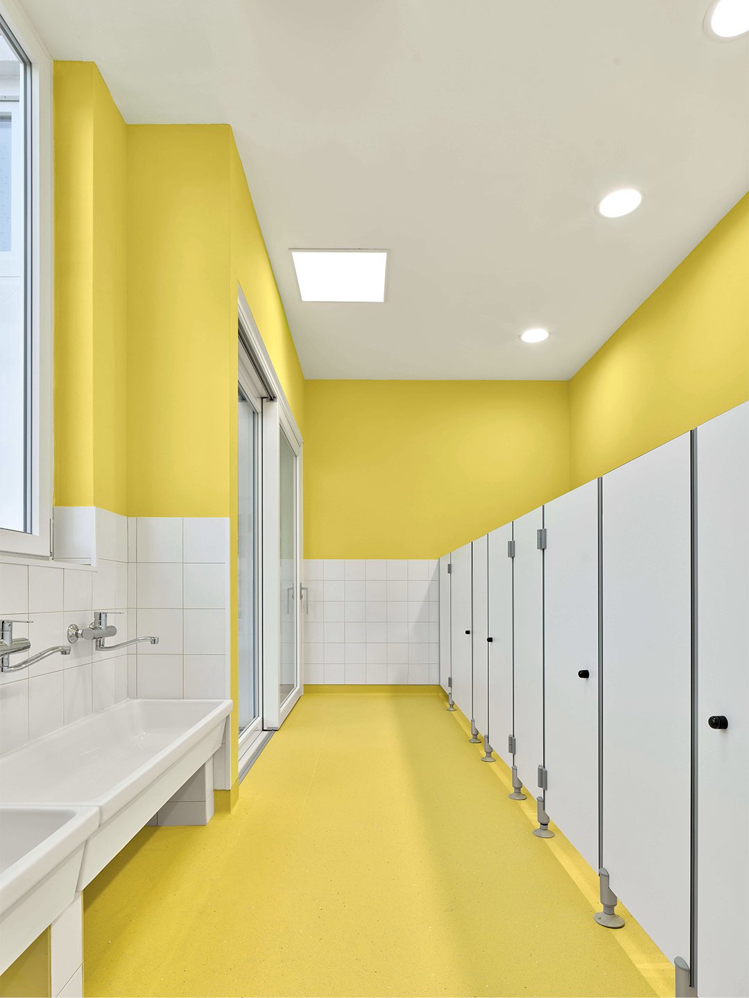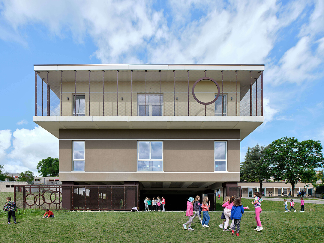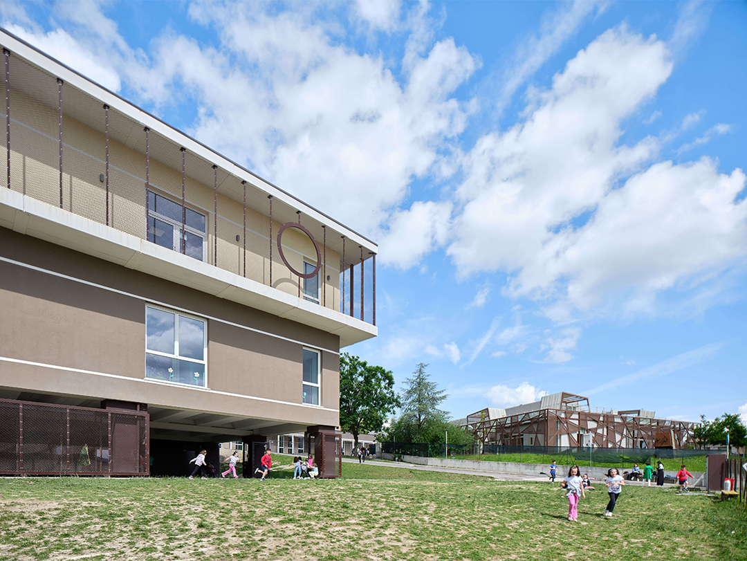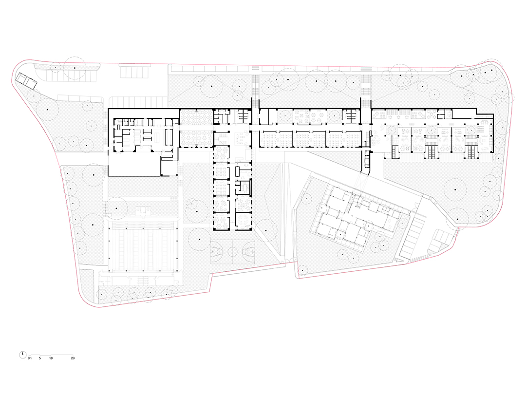 Nel progetto delle aree esterne, il dialogo costante tra i salti di quota del terreno e i livelli d’imposta degli edifici genera una complessa e divertente alternanza di tipologie di spazi all’aperto sempre diversi: zone in pendenza, distese pianeggianti coperte o scoperte, pianure attrezzate e corti interne. Tali spazi “outdoor” con la loro variabilità tipologica costituiscono un completamento di nuova generazione dell’offerta di spazi educativi tradizionali.