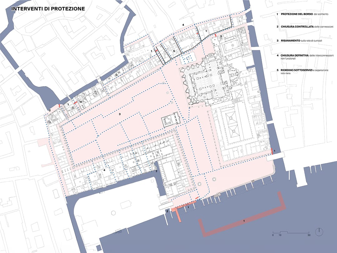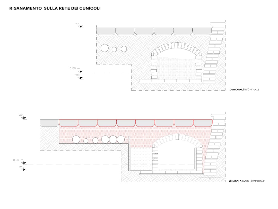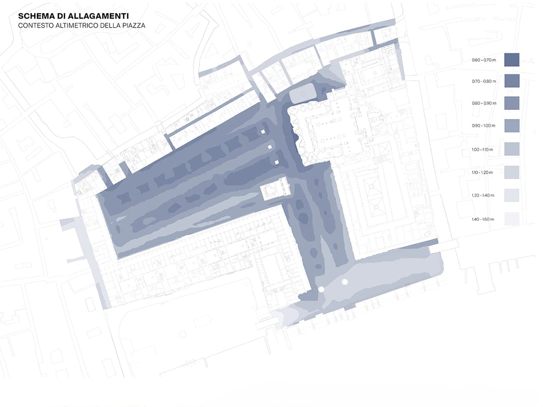 L’intervento prevede il rialzo delle pavimentazioni e delle soglie che conducono alla piazza, insieme all’impermeabilizzazione dei cunicoli e dei “gatoli” che delimitano la perimetrazione della piazza stessa.