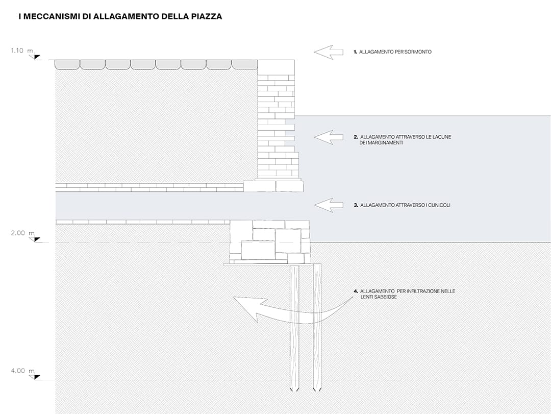 Queste strategie permetteranno un flusso naturale dell’acqua in corrispondenza della normale escursione di marea, evitando così anomale variazioni del livello di saturazione del terreno sottostante la piazza.