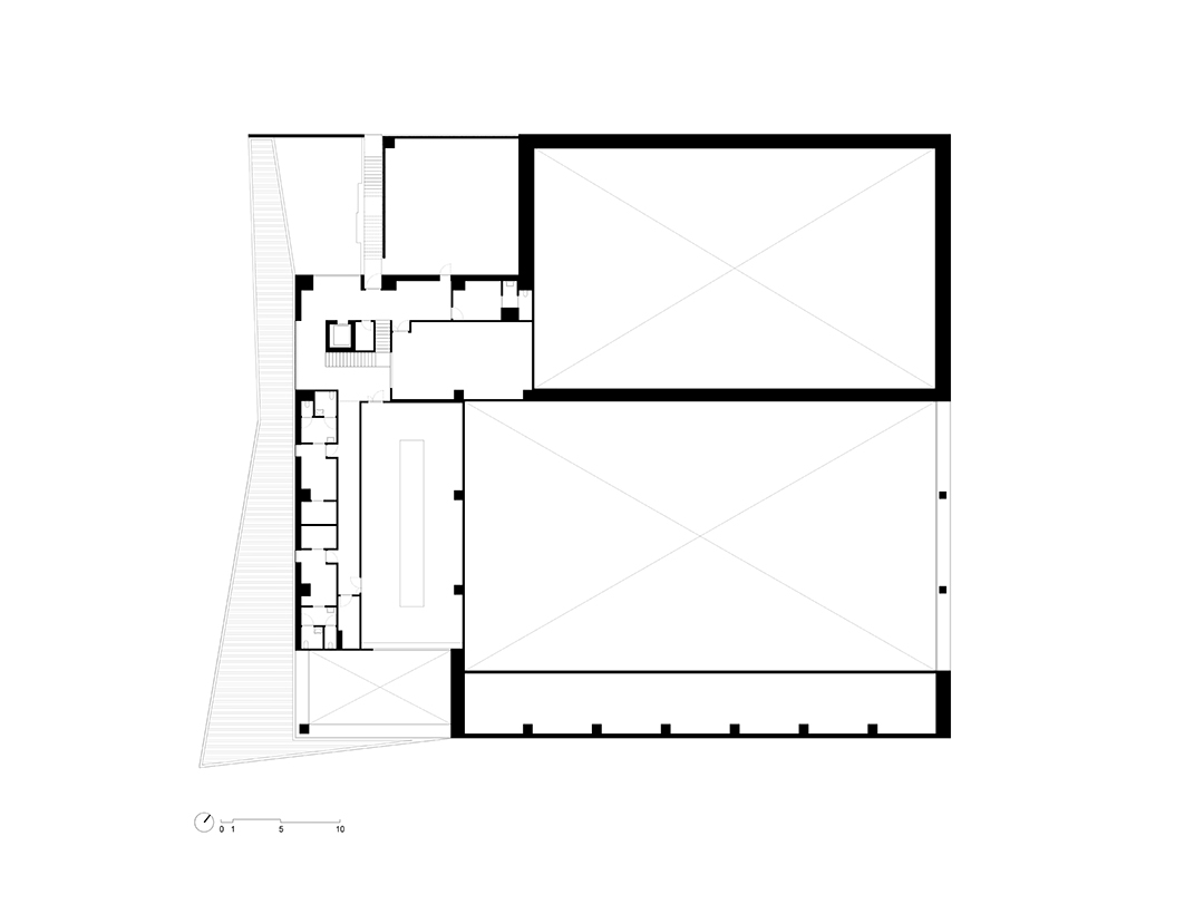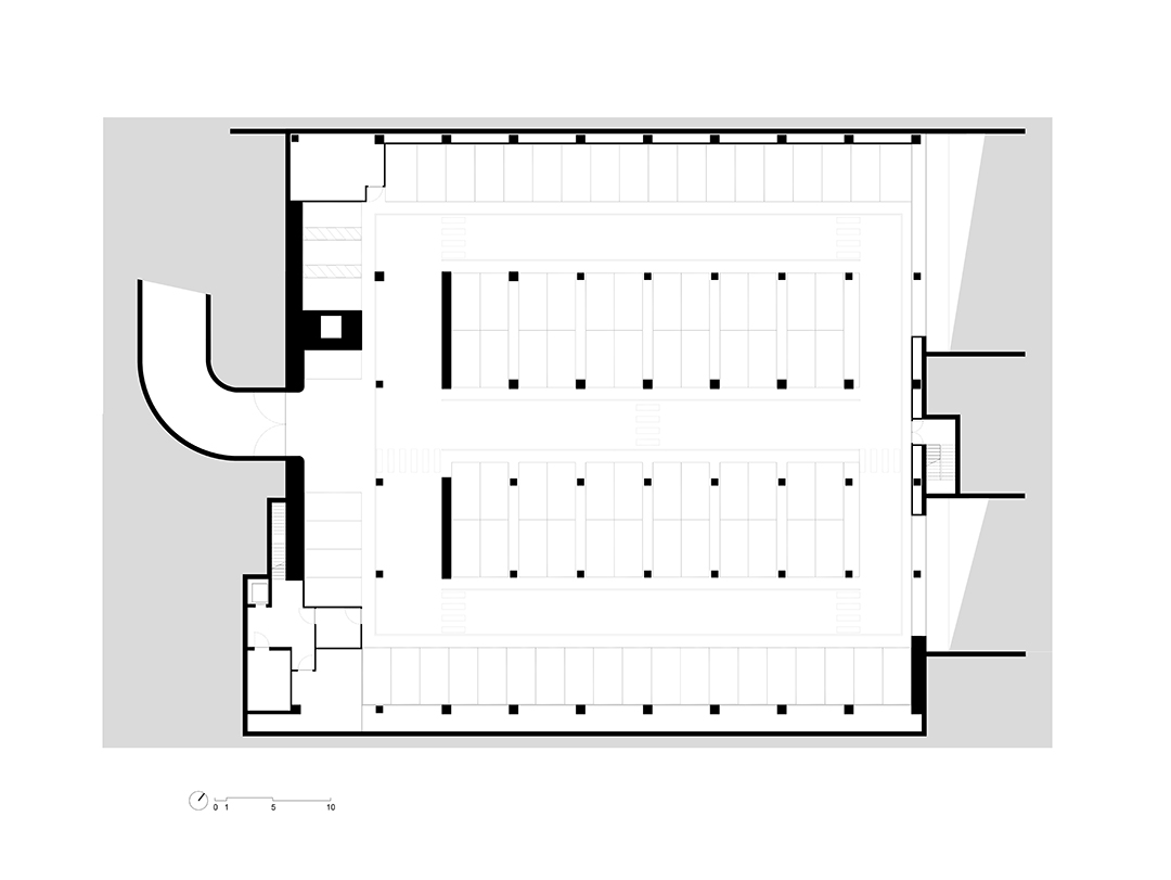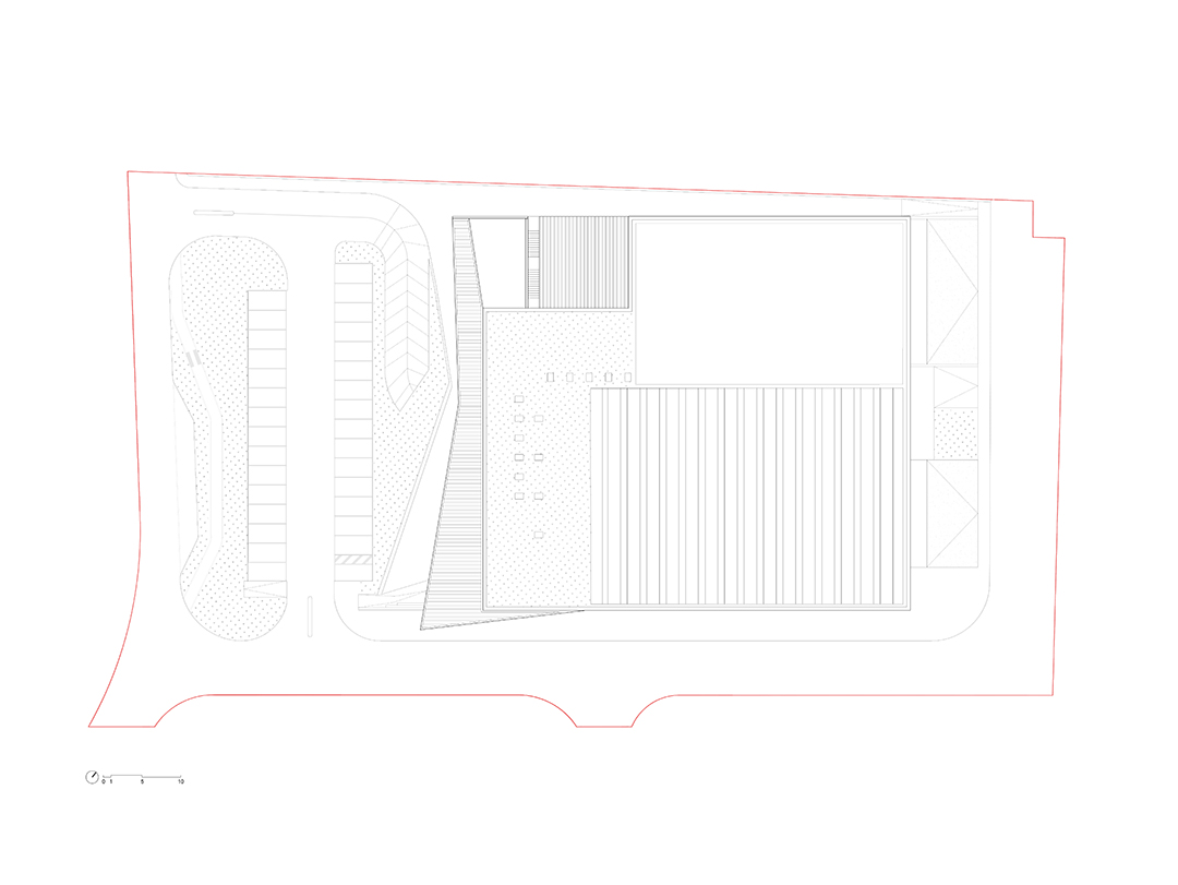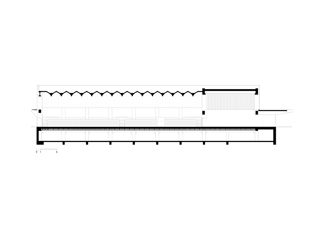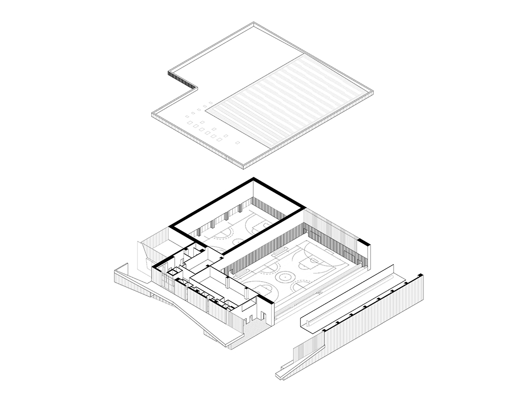 Ingressi dedicati a sportivi, visitatori e clienti della caffetteria sono distribuiti sotto alla pensilina, che accoglie e dirige i flussi, generando un ambito pubblico fruibile nelle diverse ore di apertura.
