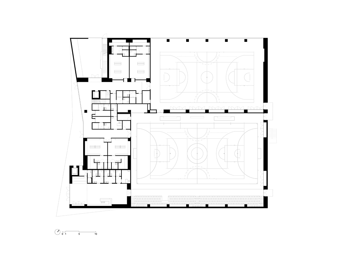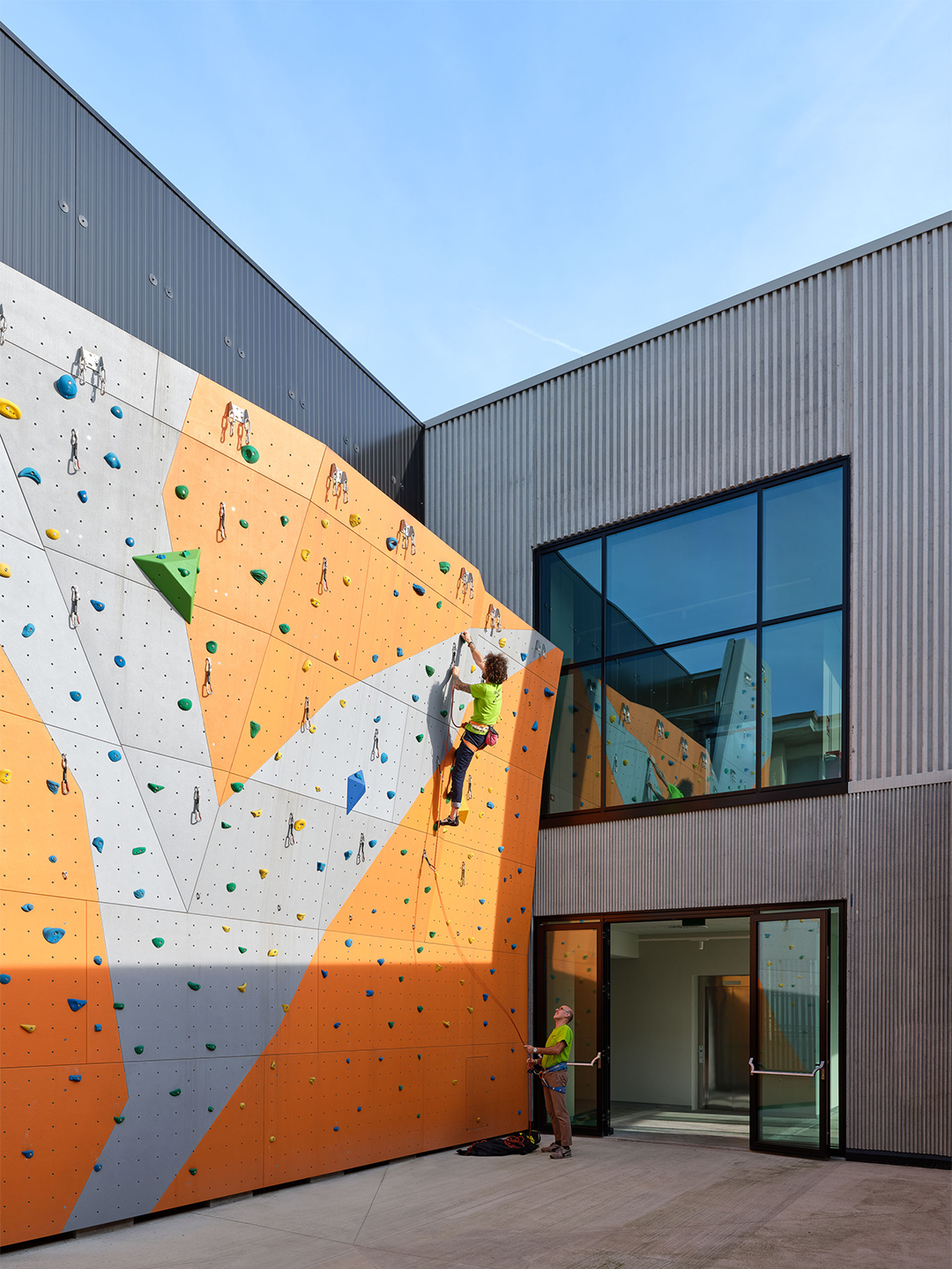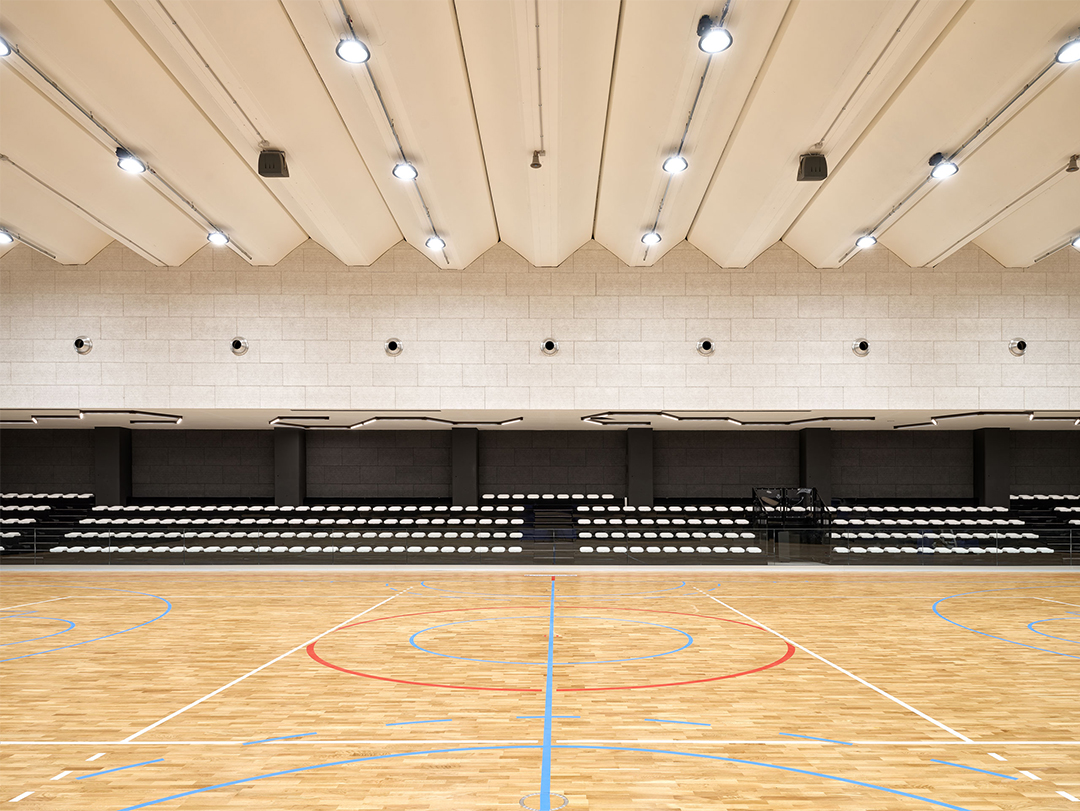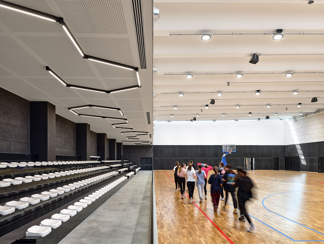 All’interno, una palestra agonistica omologata per il basket di livello silver, baskin, pallavolo e calcio a cinque è attrezzata con una tribuna da 297 spettatori. Una seconda palestra di allenamento può essere separata da una parete mobile, per l’utilizzo contemporaneo da parte di gruppi sportivi. Al piano superiore, uno spazio multiattività e una palestra dedicata alla scherma si espongono con ampie vetrate sui volumi interni a doppia altezza, creando un dialogo visivo tra le diverse discipline. Da ogni livello del fabbricato è possibile ammirare la parete di arrampicata nel cortile interno.