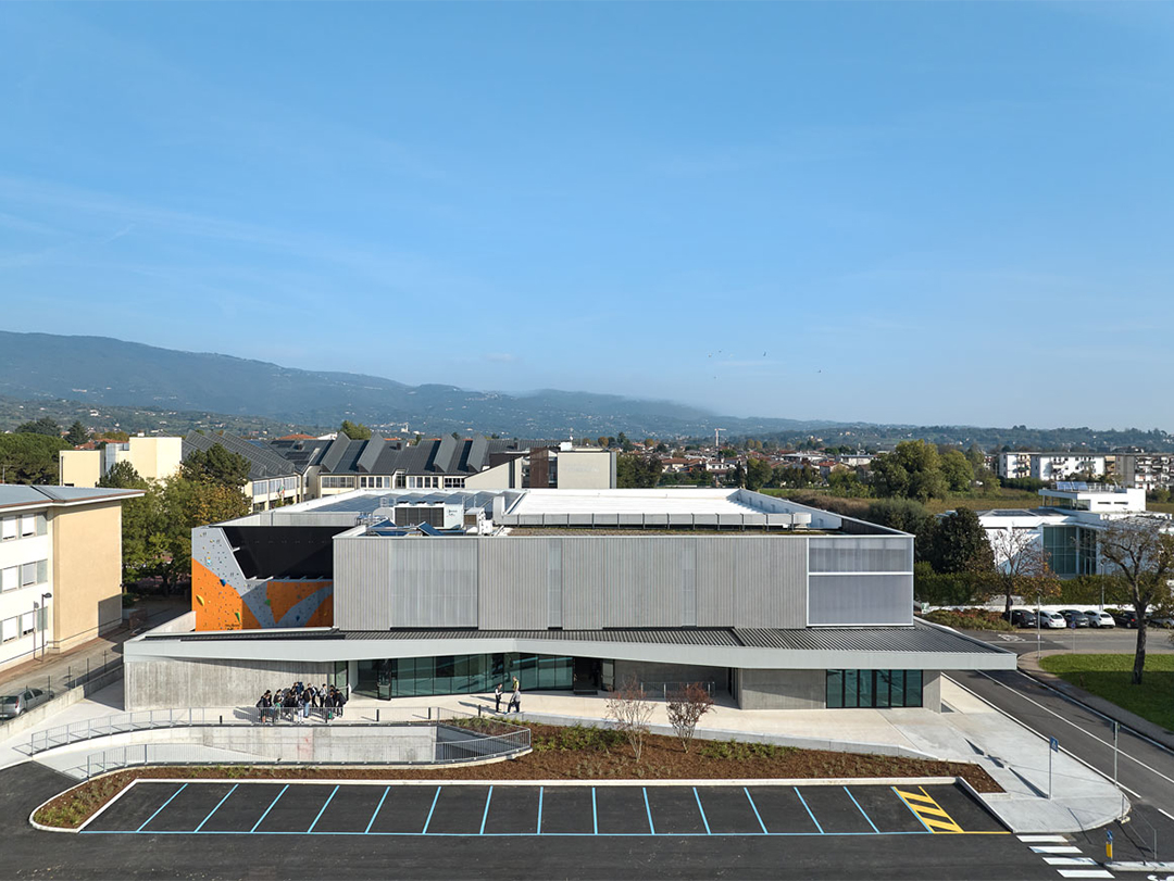 L’edificio sorge nella zona Cittadella degli Studi a Thiene, con l’obiettivo di dotare la città di un “contenitore per lo sport”. Il progetto nasce dall’articolazione di un programma funzionale in cui differenti discipline sportive si fondono con luoghi di aggregazione, generando un edificio vibrante, aperto al pubblico e agli studenti, promuovendo un’idea di spazio sportivo ed educativo capace di rafforzare l’interazione e lo scambio.